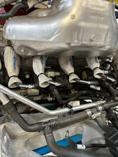 Motorsports-quality plugs and wires for C8 Corvette LT2. Katech's high-quality spark plug wire line has expanded to the LT2 C8 platform. These spark plug wires use the same motorsport boots, heat sleeve, tape, and heat shrink that our racing engines utilize. 90 deg boot on coil and spark plug end to offer additional clearance compared to the factory wires. Works great with aftermarket headers, stock manifolds, and turbo manifolds. These wires hold up excellent with the higher engine bay temps of the mid-engine C8. Wire Insulators not included but recommended, see below.