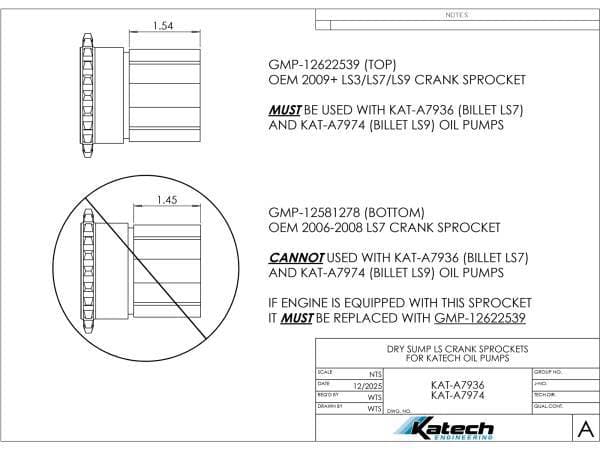 For LS7 or LS3 Dry Sump Engines that do not already have a GM LS9 Crank Sprocket, you MUST USE a GM LS9 Crank Sprocket (GM Part #12622539) for proper installation of the Katech TrackFlow™ LS7 & LS3 Billet High-Capacity Scavenge Oil Pump. Failure to change the crank sprocket will result in oil pump binding and WILL NOT BE COVERED UNDER WARRANTY.